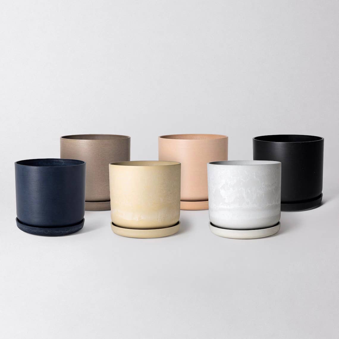 These planters offer a modern update to the traditional earthy tones. Elevate your aesthetic, and add a unique contrast to your plant collection. 9” planter pots come in 3 different colors. Each set comes with 1 planter with a drainage hole, plug, and 1 matching saucer. Made with recycled plastics, the finished product is combined with materials like natural stone and wood to completely change the nature of plastic into a green composite material. As each planter is the result of handcrafted finishes, each item contains its own personality and unique details. Materials * Recycled Plastic | Natural Stone | Wood Dust * Porous * Hand Finished 9" Planter Details * Drainage hole & plug: Yes * Indoor/Outdoor Use * Frost Proof -50C - 100C * Plant not included** * Planter Measurements: 9in Width x 8in Height * Saucer Measurements: 9in Diameter x 1.4in Height
