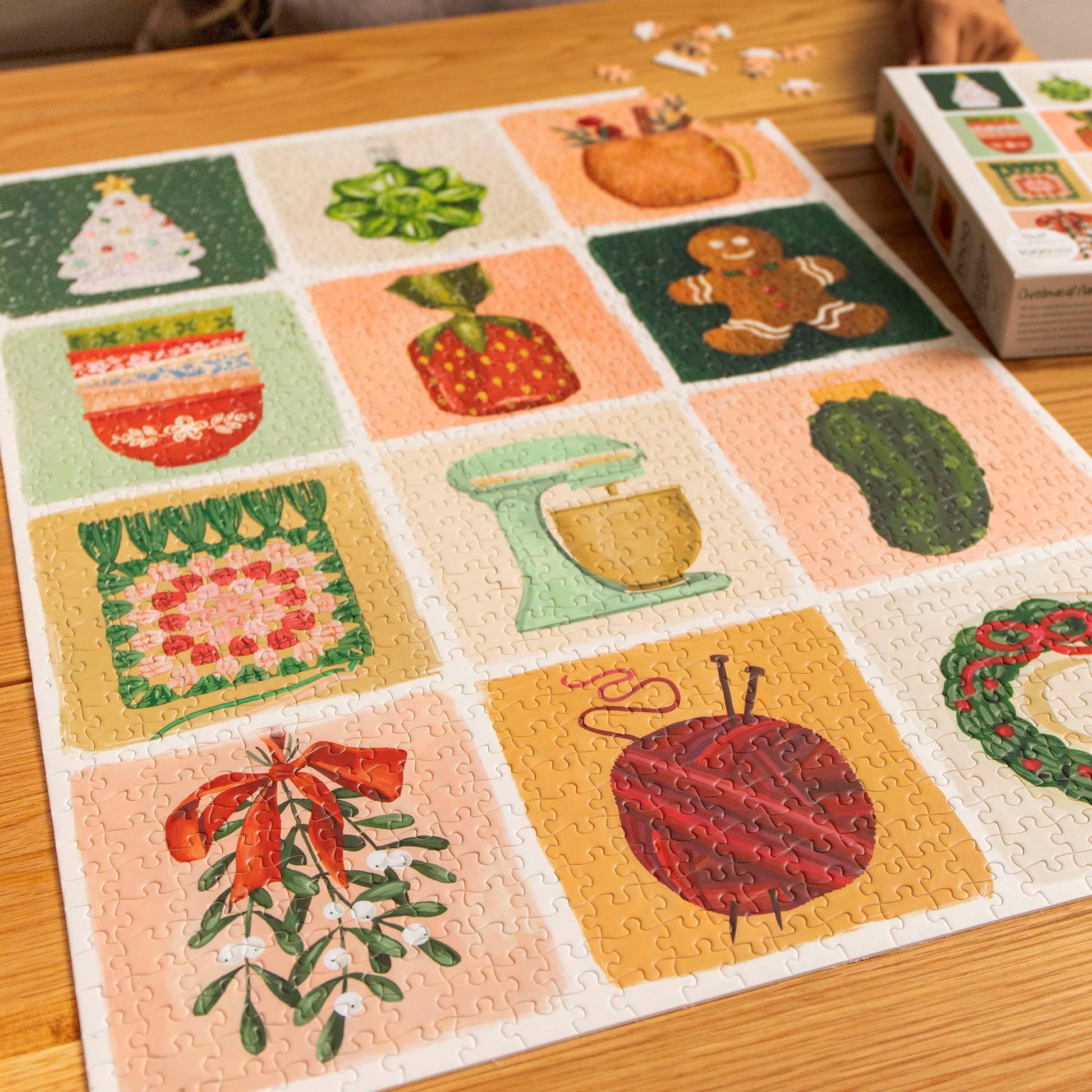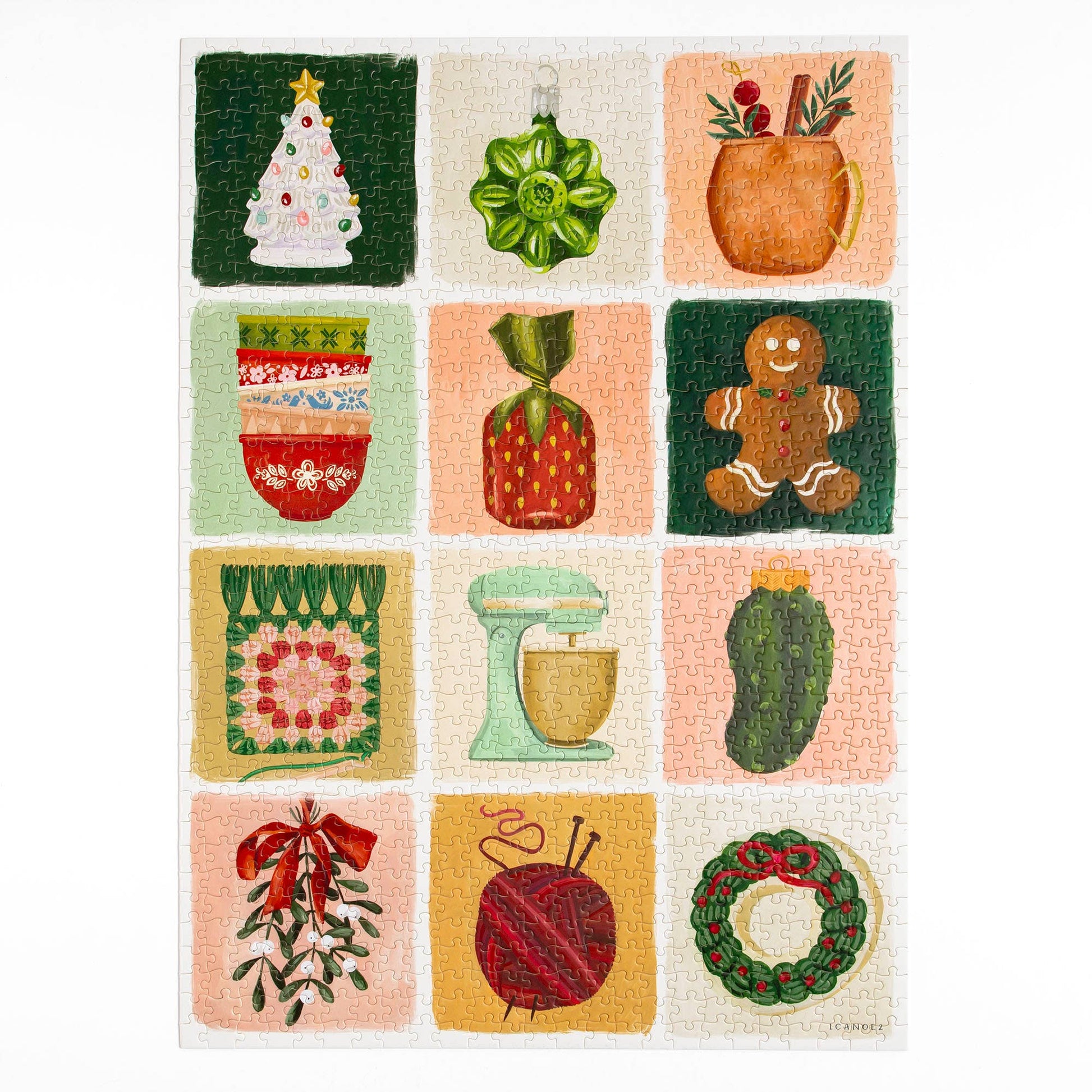 Take a trip down memory lane with our Christmas At Nana's House - 1,000 Piece Jigsaw Puzzle! This heartwarming puzzle features a grid-style design adorned with hand-painted icons reminiscent of holiday gatherings at Grandma's house. From vintage nestled mixing bowls to festive ornaments, a mixer to mistletoe, gingerbread cookies to knitting, each piece of this puzzle brings back the magic of Christmas past. With 1,000 pieces to assemble, this puzzle offers a fun challenge for puzzle enthusiasts and nostalgic souls alike. Gather your family and loved ones for a cozy evening of puzzling fun, or treat yourself to a relaxing activity and you piece together this tribute to the love and warmth found at Nana's house during Christmas.