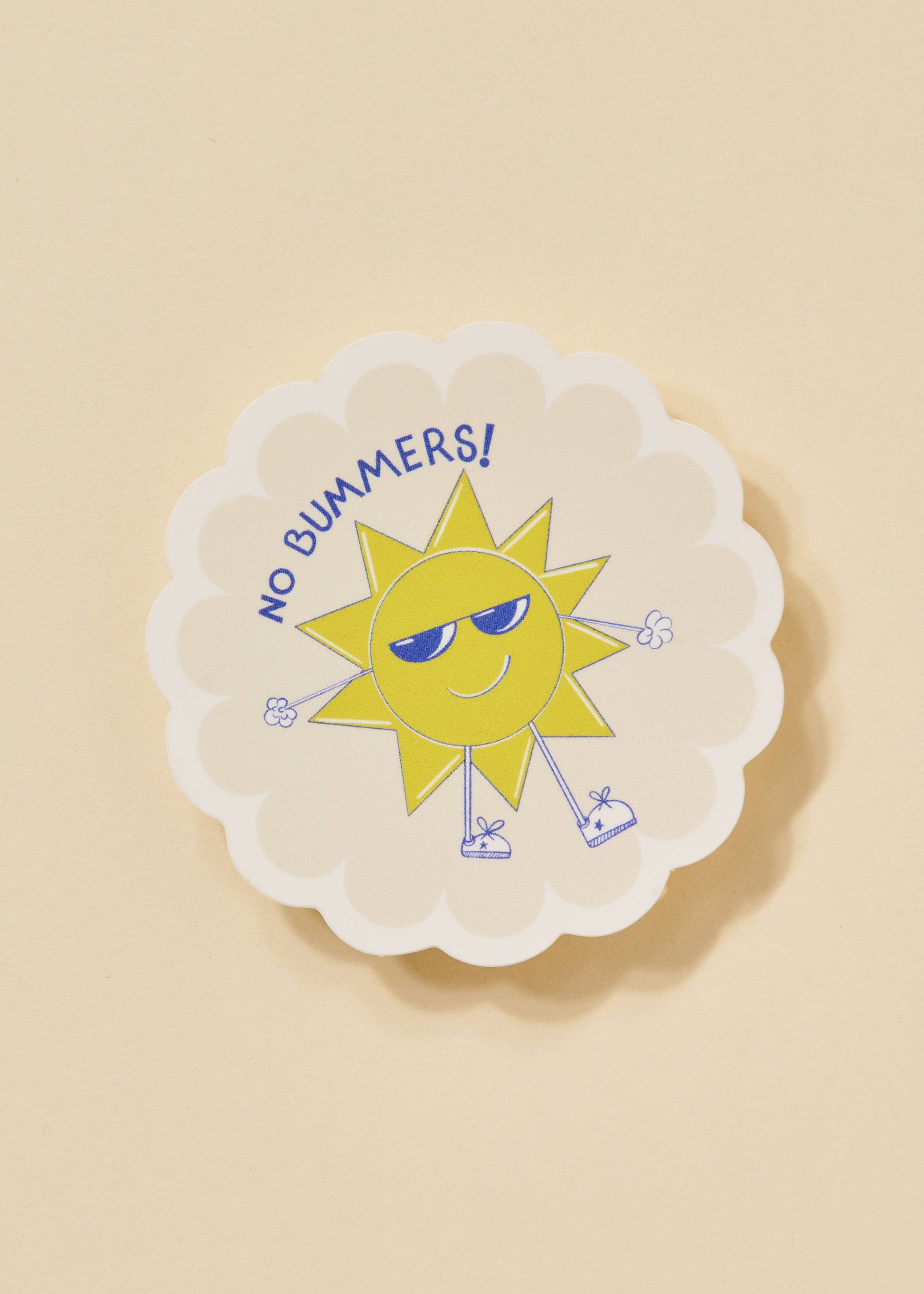 Its round shape with scalloped edges measures 3 inches and features an illustration of a smiling sun wearing sunglasses and clouds for hands.